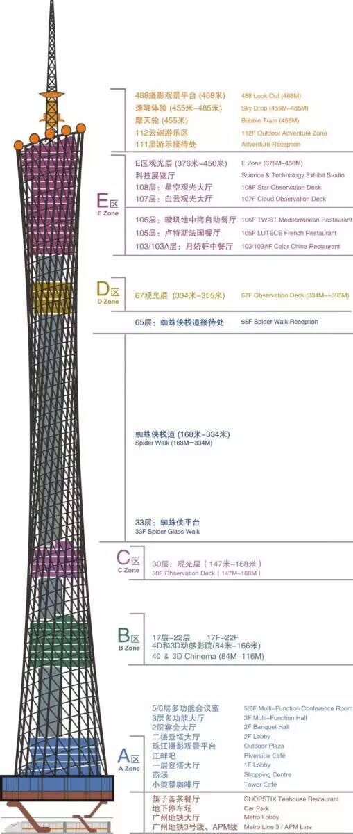 广州塔矗立在广州城市新中轴线与珠江景观线的交汇处,与海心沙亚运公园和珠江新城隔江相望,与广州歌剧院、广东省博物馆、广州图书馆、广州第二少年宫四大文化建筑遥相呼应,是广州新的制高点。广州塔塔体高约450米,天线桅杆高150米,以总高度600米占据世界第一至高电视塔的地位。广州塔大致分为A、B、C、D、E、塔顶五个区域;游玩项目大致分为娱乐与观光两大项目。